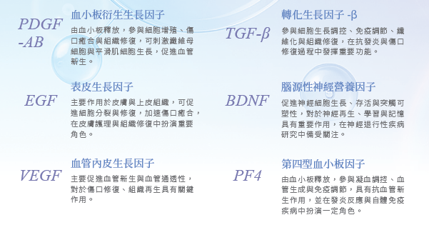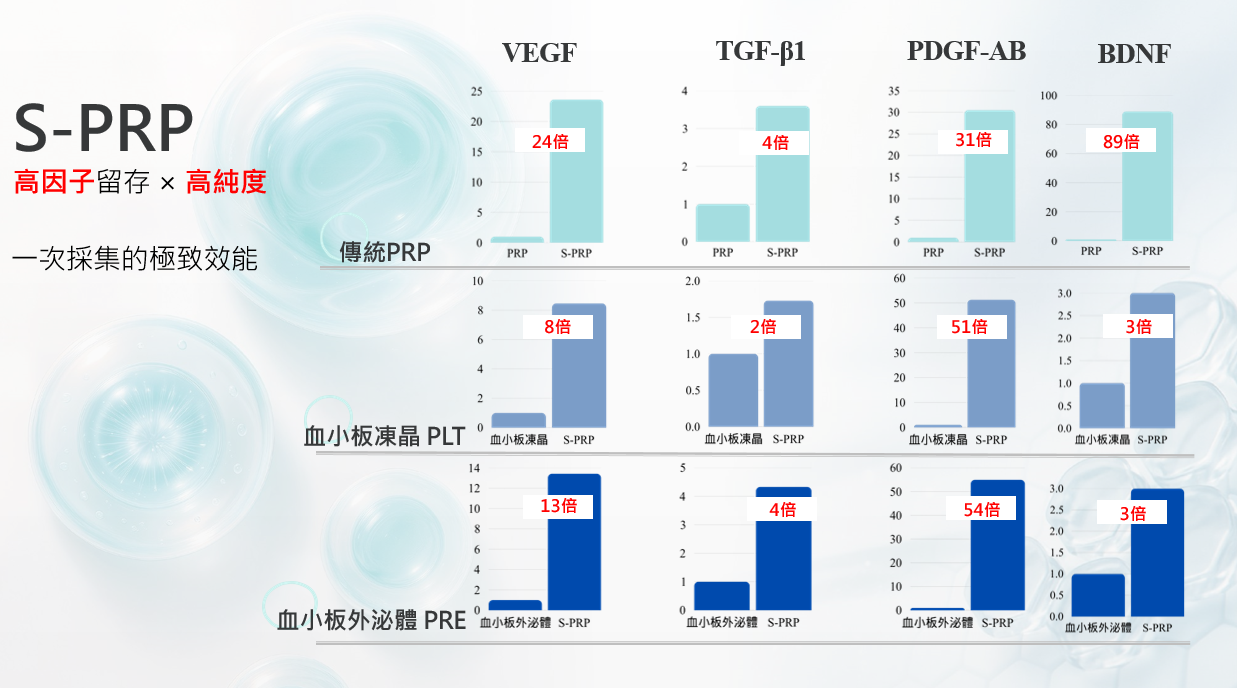 VEGF、PDGF、TGF-β 等關鍵分子濃度為傳統 PRP 的 3~30 倍以上,強化修復與再生能力。